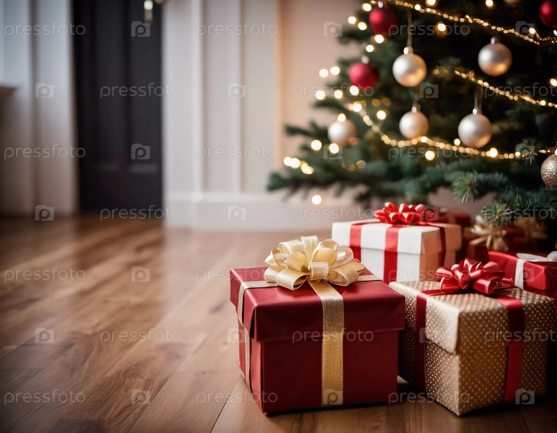 Уютная гостиная, украшенная праздничной рождественской елкой, украшенной сверкающими огнями и красочными безделушками, окруженная множеством тщательно упакованных подарочных коробок, ожидающих открытия. Искусство ИИ