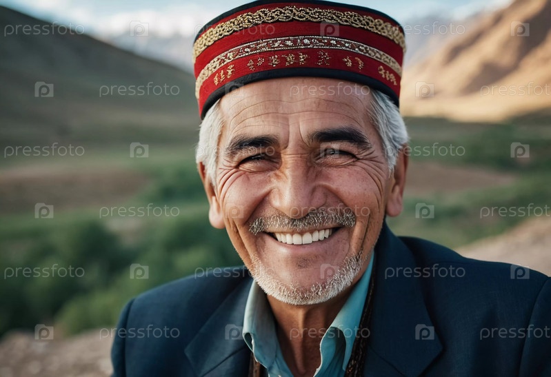 Радостный таджик 75 лет в традиционной одежде стоит на улице с широкой улыбкой на фоне природы в солнечный день. Житель Таджикистана улыбается. Сгенерировано с помощью ИИ