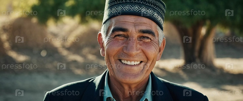 Радостный таджик 75 лет в традиционной одежде стоит на улице с широкой улыбкой на фоне природы в солнечный день. Житель Таджикистана улыбается. Сгенерировано с помощью ИИ