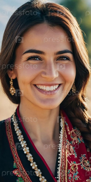Таджикская женщина 30 лет грациозно стоит, демонстрируя свой традиционный наряд на захватывающем фоне гор и сочных зеленых полей, отражающих ее культурные корни. Сгенерировано с помощью ИИ
