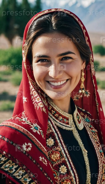 Таджикская женщина 30 лет грациозно стоит, демонстрируя свой традиционный наряд на захватывающем фоне гор и сочных зеленых полей, отражающих ее культурные корни. Сгенерировано с помощью ИИ