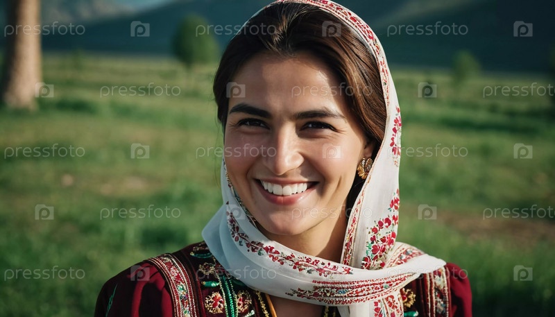 Таджикская женщина 30 лет грациозно стоит, демонстрируя свой традиционный наряд на захватывающем фоне гор и сочных зеленых полей, отражающих ее культурные корни. Сгенерировано с помощью ИИ