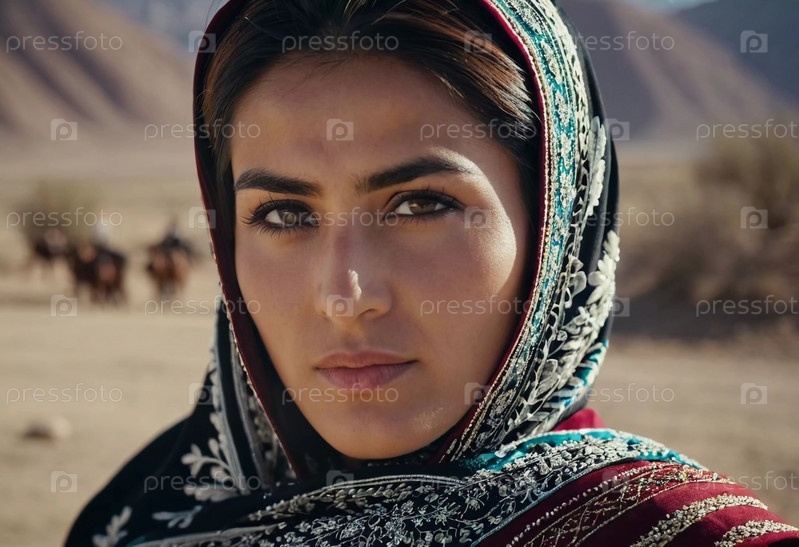 Таджикская женщина 30 лет грациозно стоит, демонстрируя свой традиционный наряд на захватывающем фоне гор и сочных зеленых полей, отражающих ее культурные корни. Сгенерировано с помощью ИИ