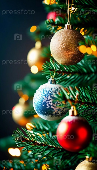 Красочные рождественские украшения украшают ветви елки, яркие шары в красных, синих, золотых и розовых оттенках, олицетворяющие праздничное настроение зимой