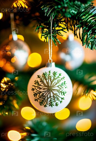 Красиво украшенная ель демонстрирует красочные рождественские шары, украшенные замысловатыми узорами. Мягкие огни боке создают теплую праздничную атмосферу, идеально подходящую для праздничного сезона. Генеративный ИИ