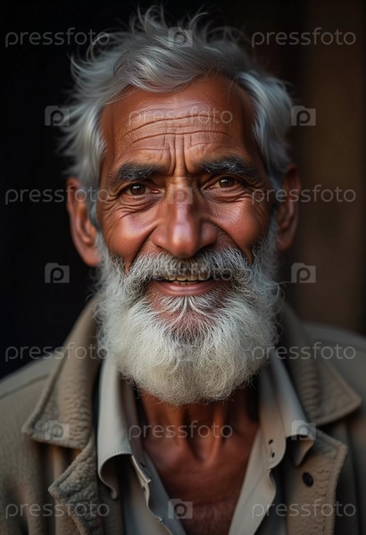 Пожилой мужчина из Индии излучает радость теплой улыбкой и мерцающими глазами. Его седые волосы и борода отражают мудрость его лет, демонстрируя жизнь, богатую опытом. Генеративный ИИ