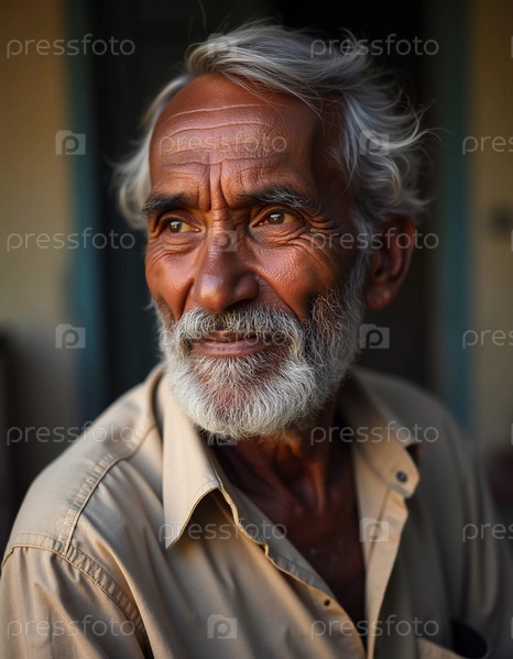 Пожилой мужчина из Индии излучает радость теплой улыбкой и мерцающими глазами. Его седые волосы и борода отражают мудрость его лет, демонстрируя жизнь, богатую опытом. Генеративный ИИ