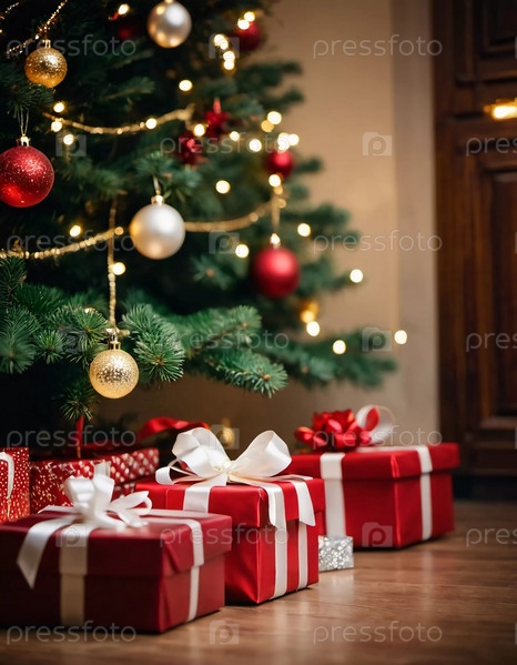 Празднично упакованные подарки, окруженные красочными рождественскими шарами под красиво украшенной елью во время радостного новогоднего сезона. Генеративный ИИ