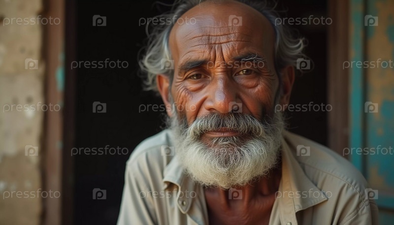 Пожилой мужчина из Индии излучает радость теплой улыбкой и мерцающими глазами. Его седые волосы и борода отражают мудрость его лет, демонстрируя жизнь, богатую опытом. Генеративный ИИ