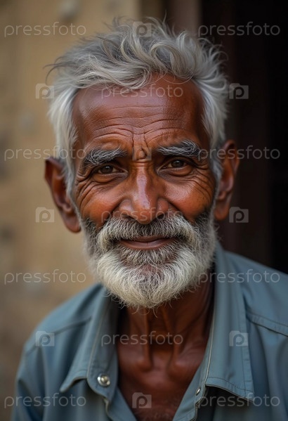 Пожилой мужчина из Индии излучает радость теплой улыбкой и мерцающими глазами. Его седые волосы и борода отражают мудрость его лет, демонстрируя жизнь, богатую опытом. Генеративный ИИ
