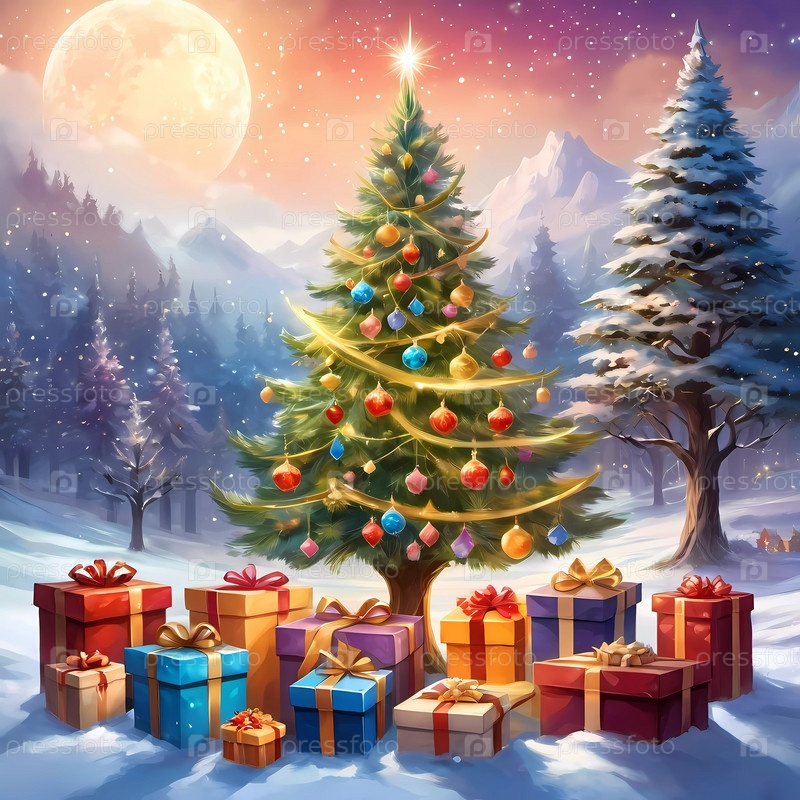 Декорированная рождественская елка, украшенная разноцветными игрушками и сложенными подарками, готова к празднованию в уютной праздничной обстановке. упакованные подарки разных цветов. Праздничная атмосфера, теплота и радость. AI