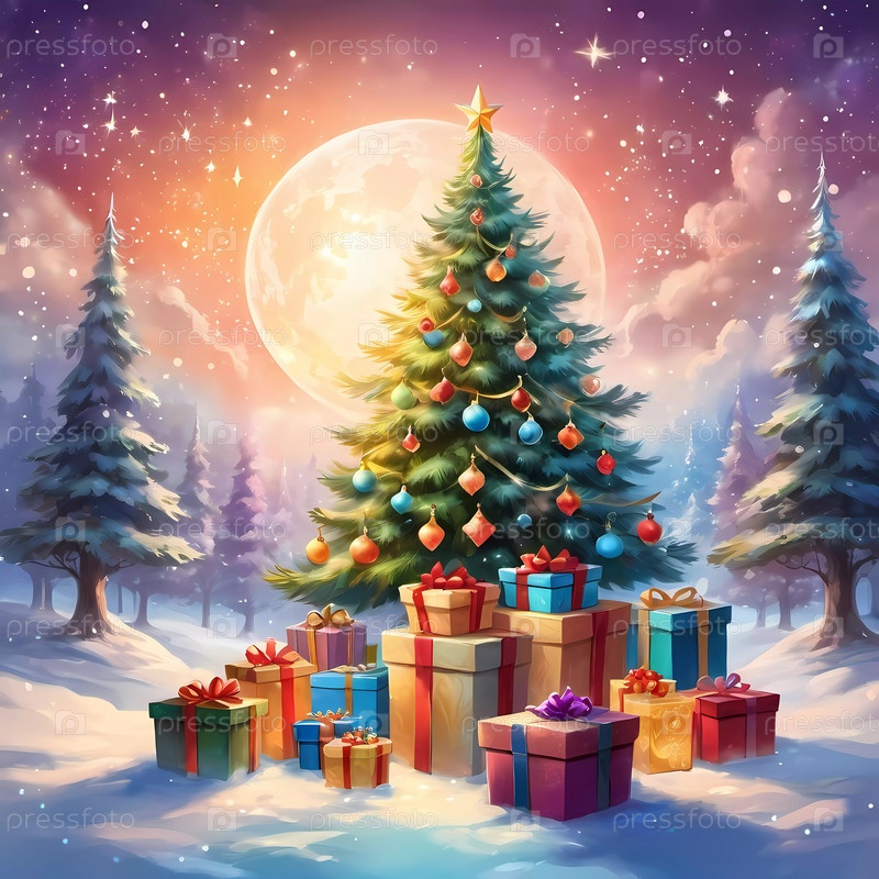 Декорированная рождественская елка, украшенная разноцветными игрушками и сложенными подарками, готова к празднованию в уютной праздничной обстановке. упакованные подарки разных цветов. Праздничная атмосфера, теплота и радость. AI