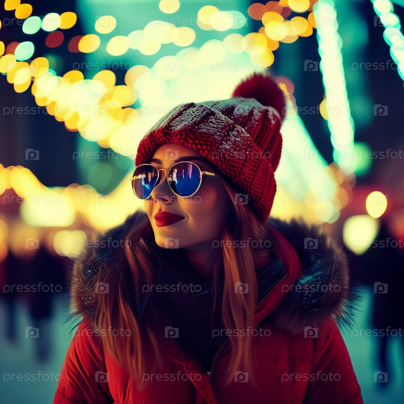 Мягко падает снег, когда женщина в стильных солнцезащитных очках и теплом пальто прогуливается по городу, украшенному красочными рождественскими огнями, празднуя праздничный дух. Генеративный ИИ