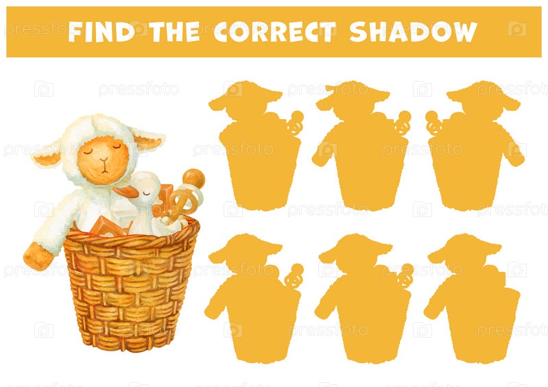 Найдите правильную тень из большой плетеной корзины с плюшевыми и деревянными игрушками. Развивающая игра на совпадение для детей со спящим ягненком и уткой или гусеницей в корзине. Логическая игра, учебная карточка. Find the correct shadow of large wi