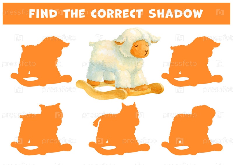 Найдите правильную тень акварельной игрушки-качалки, спящего ягненка. Выберите правильный ответ о плюшевой игрушке. Игра на соответствие. Иллюстрация мягкой игрушки на белом фоне для учебных карточек. Find the correct shadow of watercolor Rocking toy sl