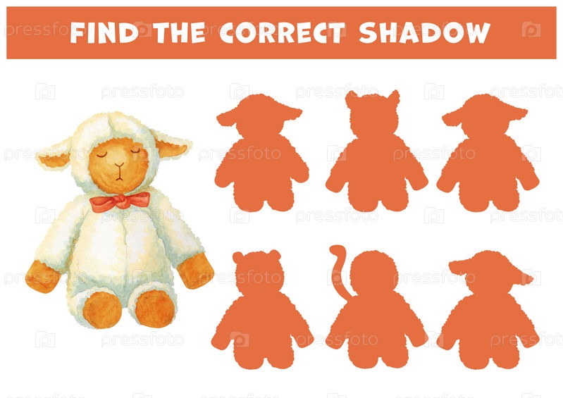 Найдите правильную тень спящего ягненка. Выбор правильного ответа. Развивающая игра на внимание для детей. Нарисованная акварелью плюшевая игрушка для детской спальни в учебной игровой карточке. Find the correct shadow of watercolor sleeping lamb