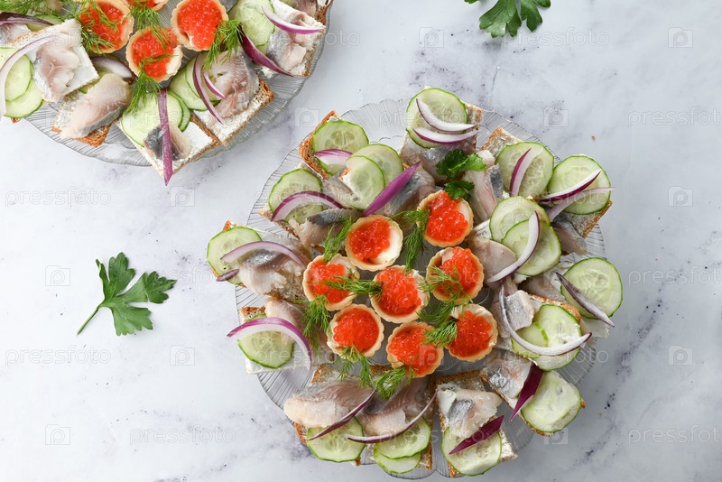 Вид сверху на вкусные закуски с огурцом, луком, рыбой и икрой на белой тарелке и столе