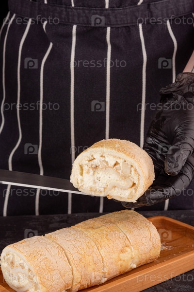 Десертный рулет из безе со свежей грушей на темном фоне в кофейне. Копировать пространство