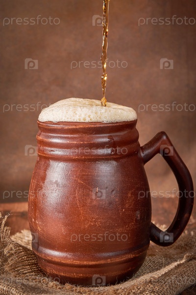 Пивная глиняная коричневая кружка с квасом на деревянном столе на темном фоне. Традиционный напиток из хлеба, закваски