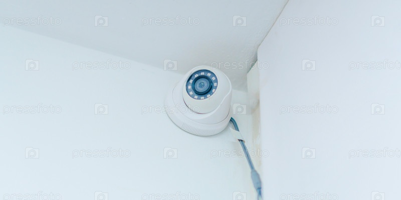Внутренняя камера видеонаблюдения на белой стене под потолком