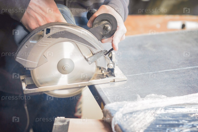 Плотник режет деревянную панель электроинструментом