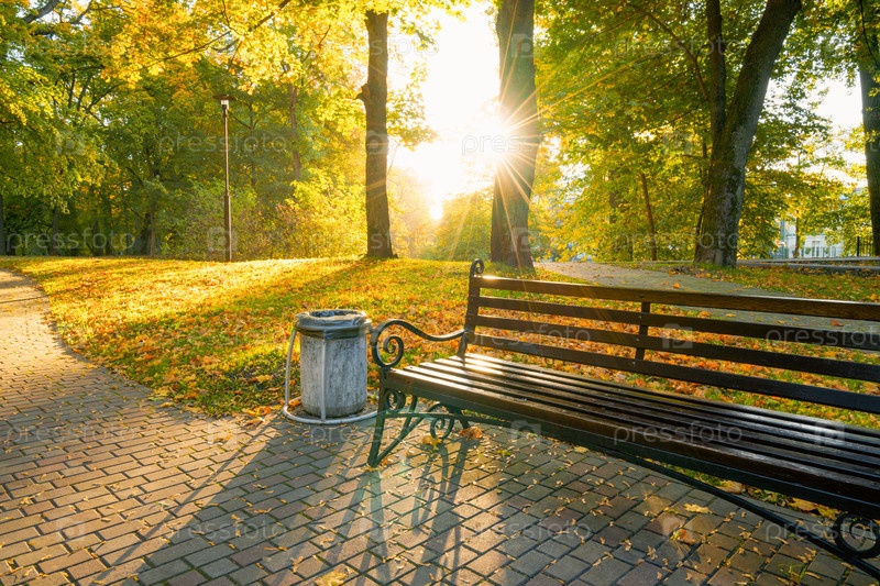 Скамейка в осеннем парке, желтая листва и яркое солнце
