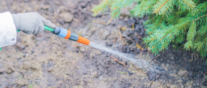 Садовник поливает дерево из шланга