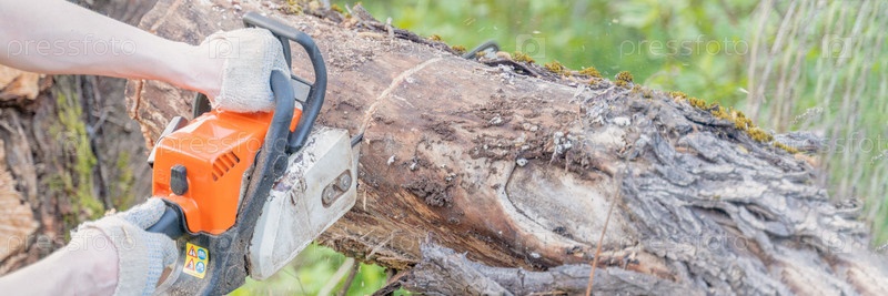 Фермер пилит дерево бензопилой, выборочная фокусировка, фокус на переднем плане, размытый фон