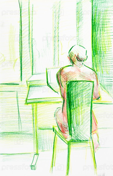Нарисованный от руки подросток сидит возле стола с ноутбуком