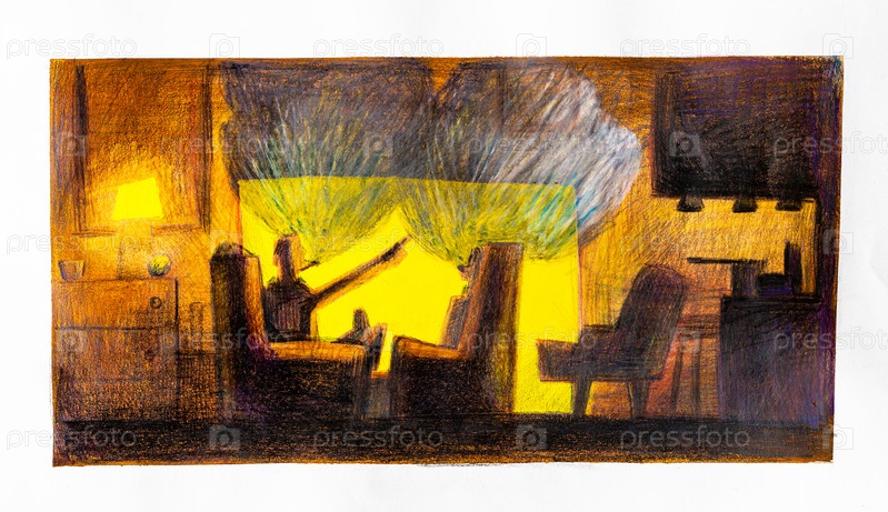 Нарисованные от руки джентльмены курят трубки возле камина