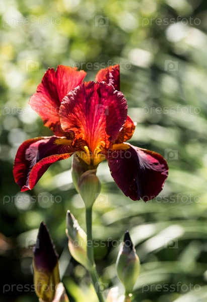 Красный, бордовый цветок ириса в цветущем летнем саду. Красивый естественный природный фон