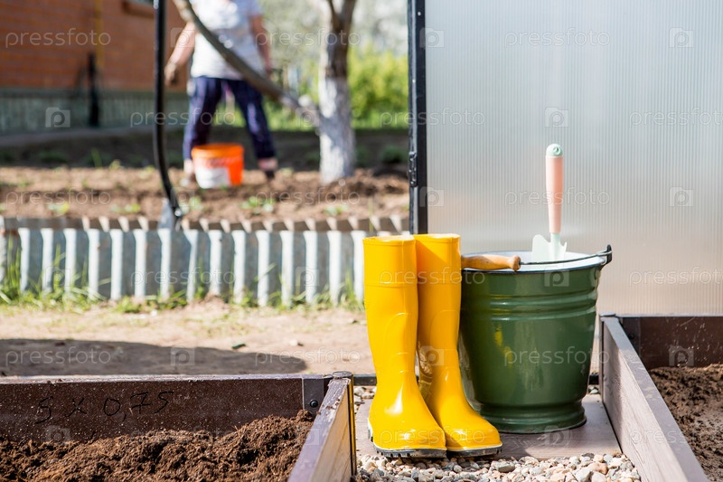 Желтые резиновые сапоги, ведро и маленькая лопатка в новой теплице. Концепция весенней посадки овощей и земледелия
