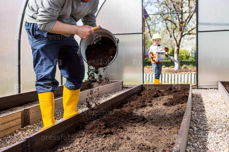 Мужчина-фермер насыпает новую почву, почву для новой теплицы. Концепция весенней посадки овощей, установки теплицы и фермерства