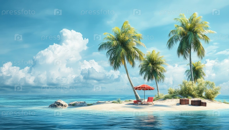 Солнечный райский остров с пальмами и спокойными водами
