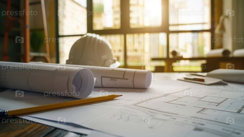 Архитектурное рабочее место с чертежами, карандашами и защитной каской при дневном свете