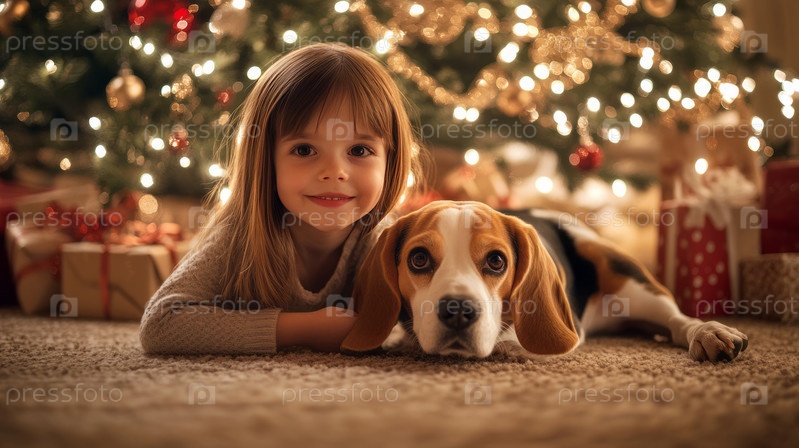 Теплая и уютная сцена передает дух праздника с помощью светящихся рождественских огней и красиво упакованных подарков под елкой