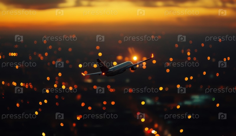 Элегантный частный самолет, парящий над очаровательным городом на закате
