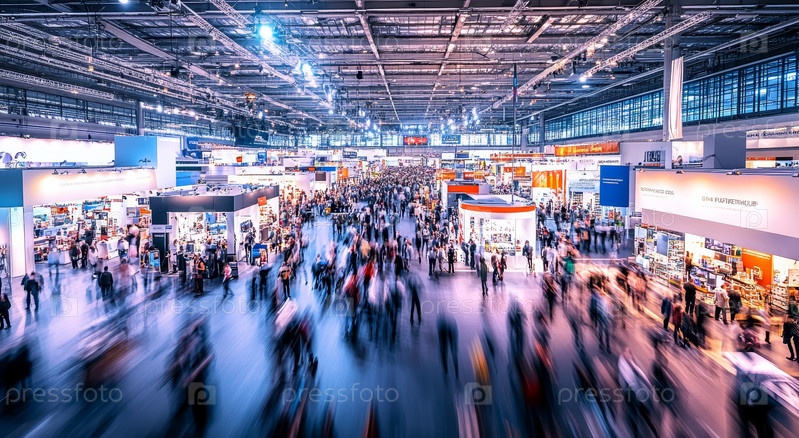 Оживленный выставочный зал, заполненный динамичными экспозициями и толпами, передающий живую энергию и инновации современной торговой выставки