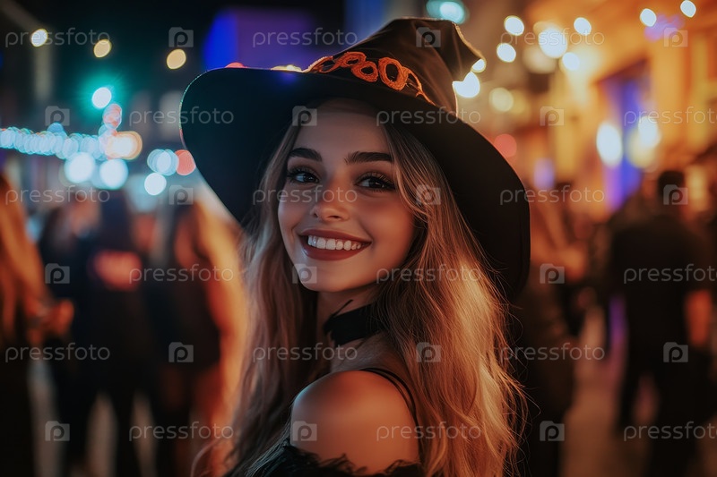 Человек, одетый как ведьма, наслаждается праздничной ночью во время многолюдного уличного празднования Хэллоуина, освещенного яркими огнями