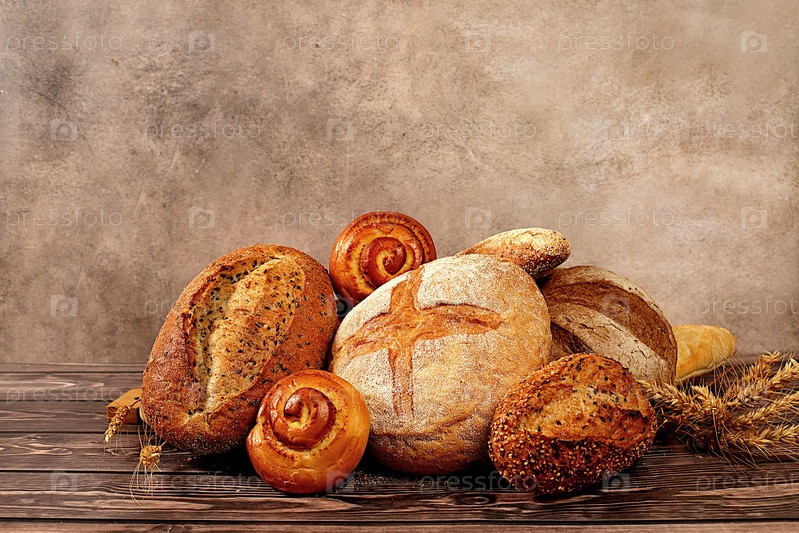Свежеиспеченные хлебобулочные изделия, цельнозерновой домашний хлеб, различные виды круглого хлеба на закваске с хрустящей корочкой, багеты, булочки и колосья пшеницы на деревянном фоне, современная концепция выпечки