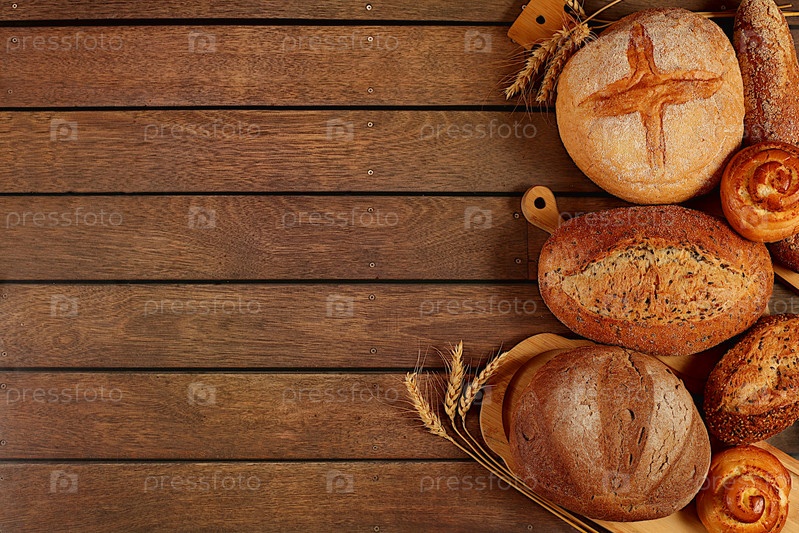 Свежеиспеченные хлебобулочные изделия, цельнозерновой домашний хлеб, различные виды круглого хлеба на закваске с хрустящей корочкой, багеты, булочки и колосья пшеницы на деревянном фоне, современная концепция выпечки