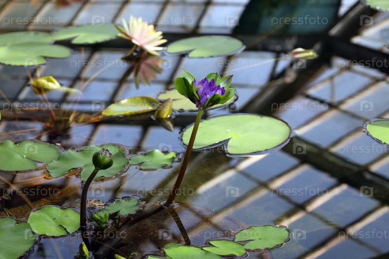 Водяная лилия (нимфея) необычного синего цвета в тропической оранжерее