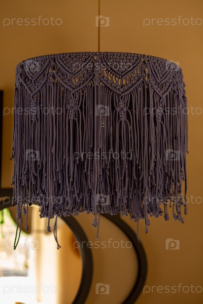 Абажур в технике макраме с бахромой, подвешенный на теплом фоне