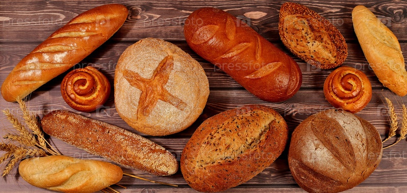 Свежеиспеченные хлебобулочные изделия, цельнозерновой домашний хлеб, различные виды круглого хлеба на закваске с хрустящей корочкой, багеты, булочки и колосья пшеницы на деревянном фоне, современная концепция выпечки