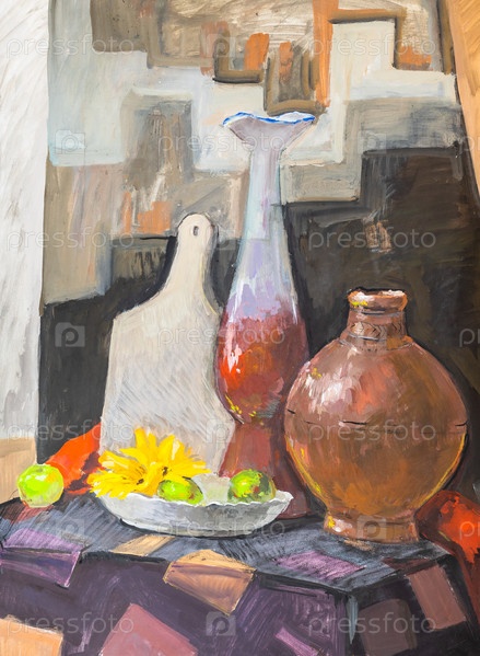 Натюрморт с вазами, разделочная доска, расписанный вручную