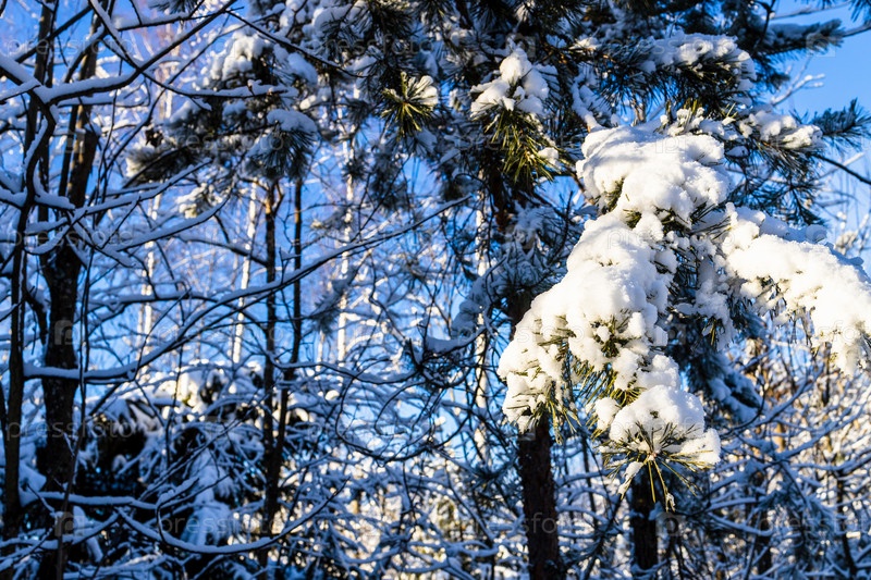 Заснеженная ветка сосны в солнечный зимний день