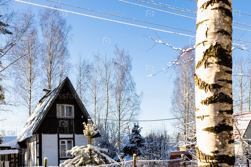 Береза и замерзшие провода, освещенные заходящим солнцем