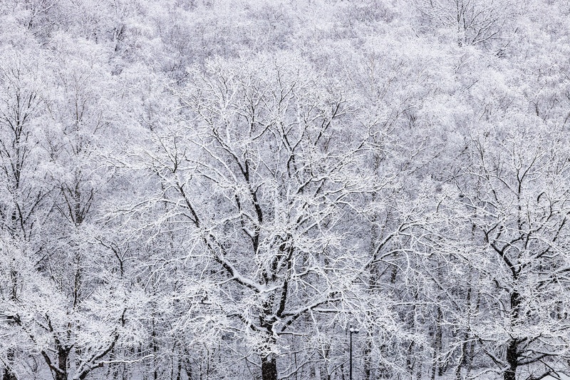 Вид сверху на заснеженные дубы во время снегопада