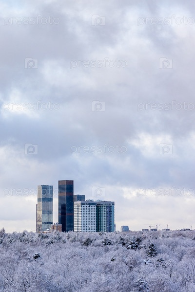 Облачное небо над небоскребами и парком после снегопада