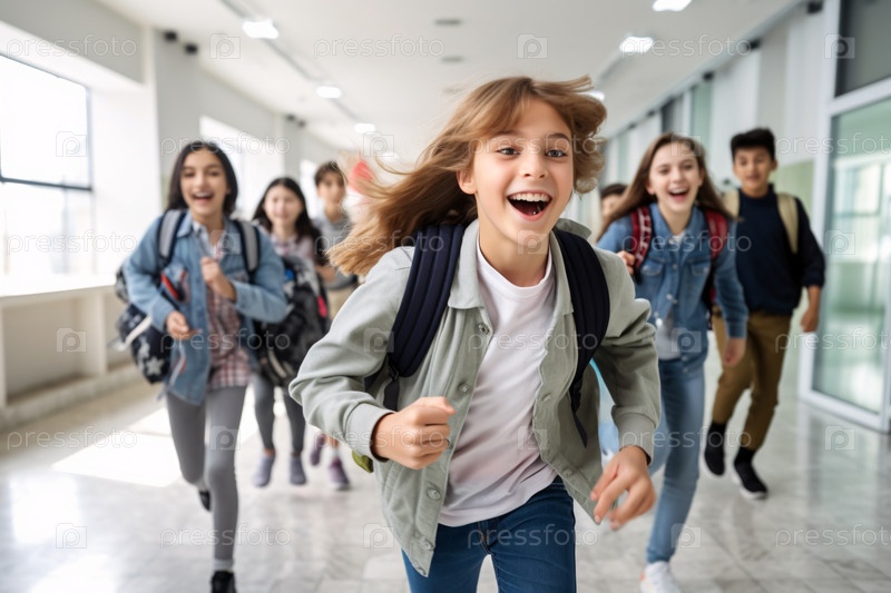 Радостные школьники бегут по коридору, возбужденные и энергичные